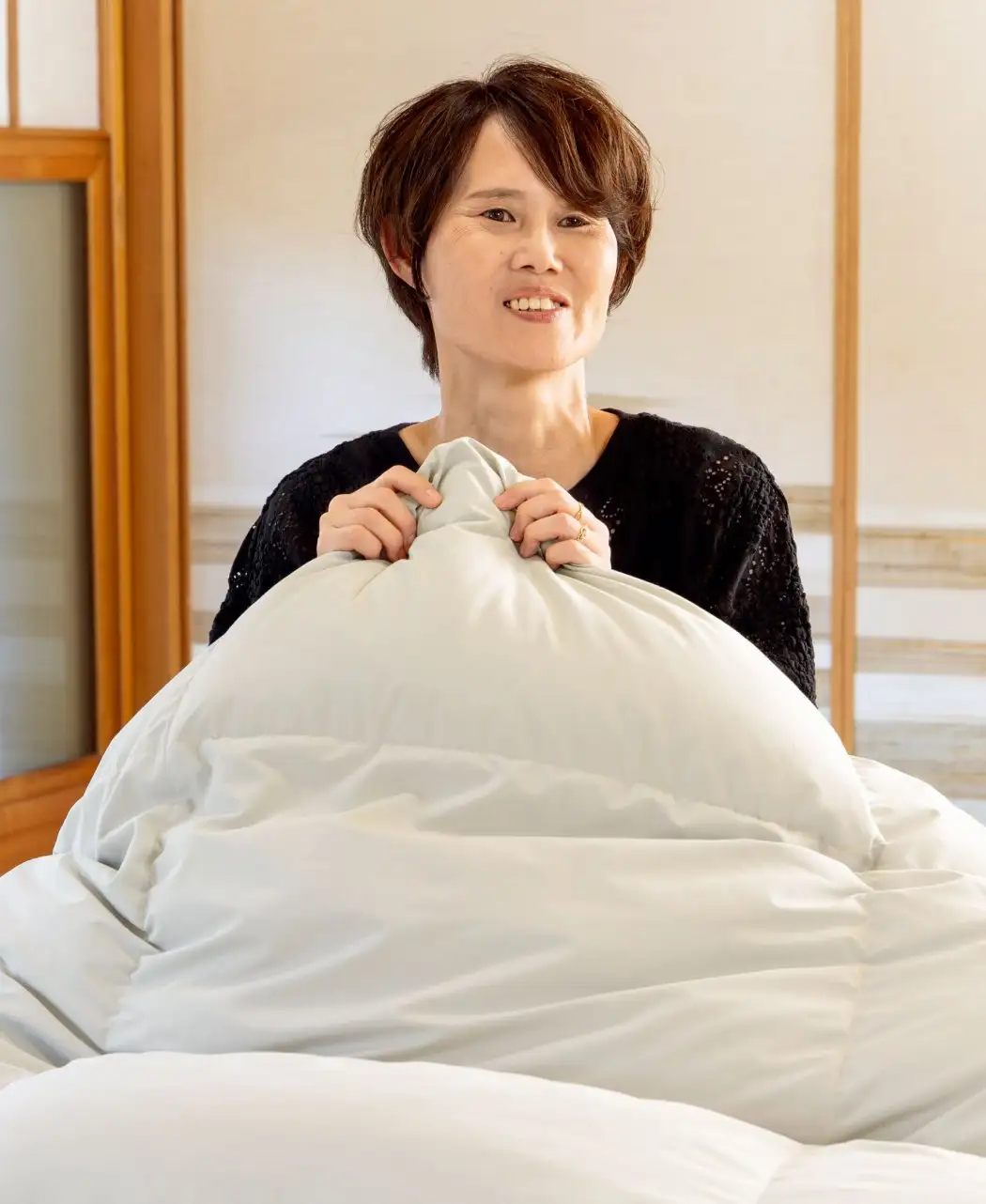 冬の夜、冷え切った寝室でこの布団に潜り込むと、肩からつま先までやさしい暖かさで包んでくれて、そのまま朝までぬくぬくが続く。この感じはほかには代えがたいです。