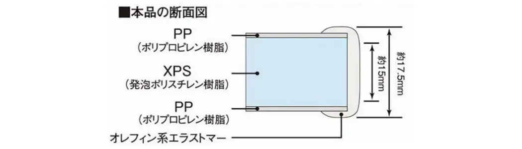 本品のパネル内部には、軽くて熱を逃しにくく、住宅用断熱材として定評のある発砲ポリスチレンを使用。これを上下から熱伝導率の低いポリプロピレンで挟んだ独自の3層構造(厚さ約15mm)を採用(下記断面図参照)。これにより浴槽内の熱がふたから逃げにくい。