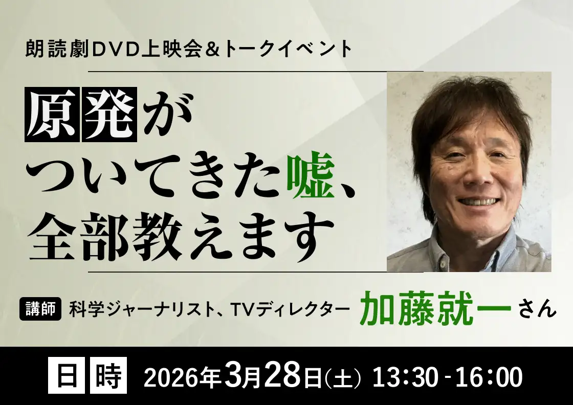 加藤さんの著書をもとにした朗読劇のDVD上映(72分)と「原発トンデモ話」をお届けします。