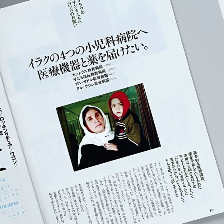 湾岸戦争以降、情勢が不安定なイラクにおいて、がんの子どもたちを支援するJIM-NET(日本イラク医療支援ネットワーク。)の活動に賛同し、読者にカンパを呼びかけました。集まったカンパは薬品や医療器具の購入、看護師の研修に充てられ、子どもたちの死亡率低下に貢献しました。