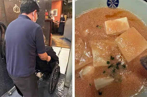 車椅子用のスロープを置いてもらう。思い出のたらこ豆腐。(写真・本人提供)