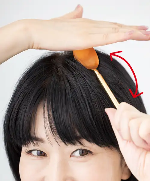 ❶スプーンの背を頭皮に当てて手のひらで軽く固定する。