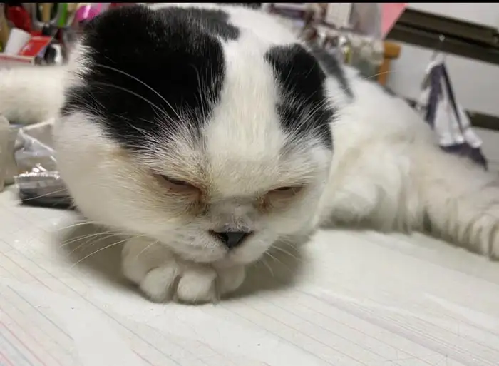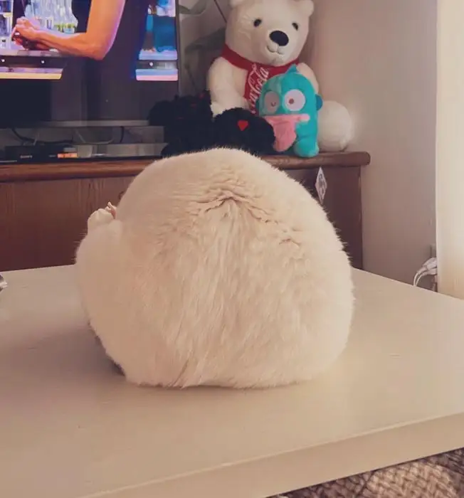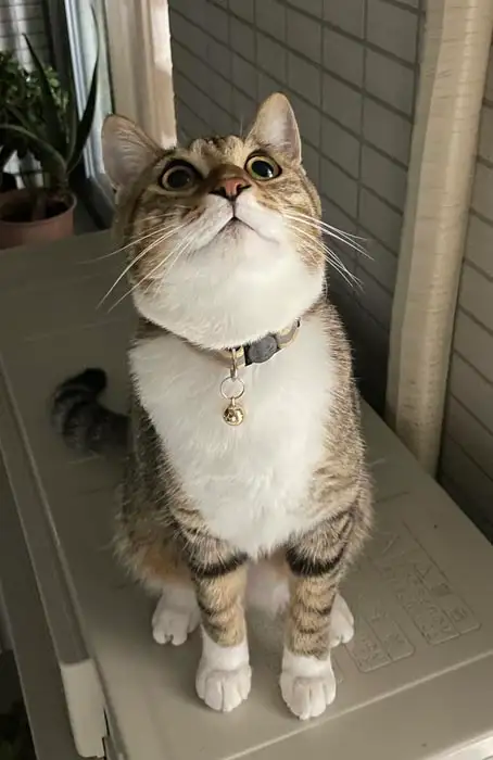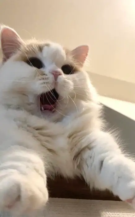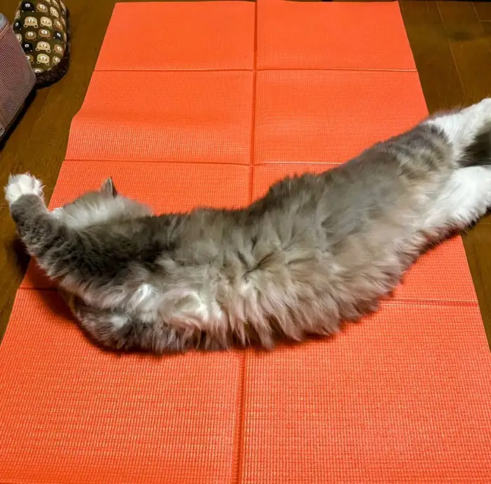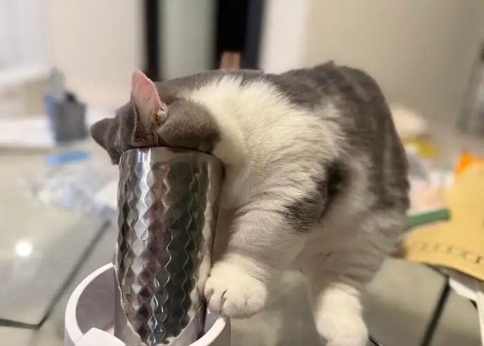 そうとうふかふかふわふわの身体つき。金属の筒? コップ? に顔をめりこませて、たまらなくかわいいですよね。シルバーの硬質感が、ネコのもふもふの柔らかさを引き立てています。