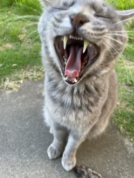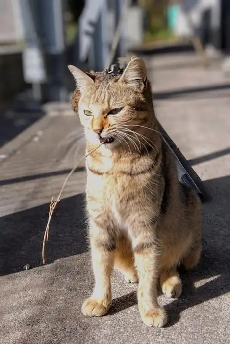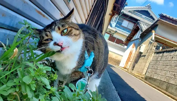 リードをつけてお散歩中。飼い主さんに大事にされている感じが伝わってきます。きっと家にネコ草はあるでしょうに、道端の草をガシガシ頬張り「やっぱこれウマイわー」みたいなドヤ顔。飼い主泣かせです。
