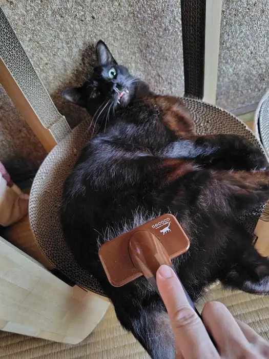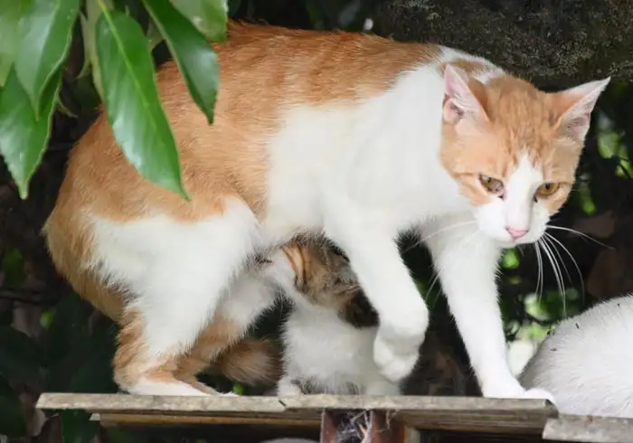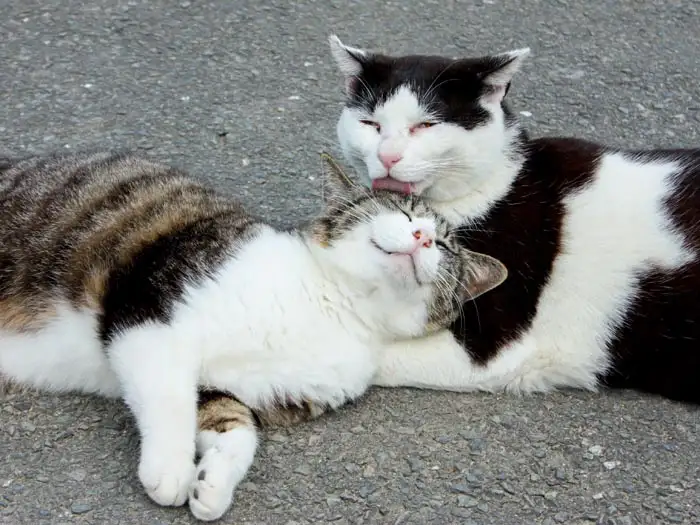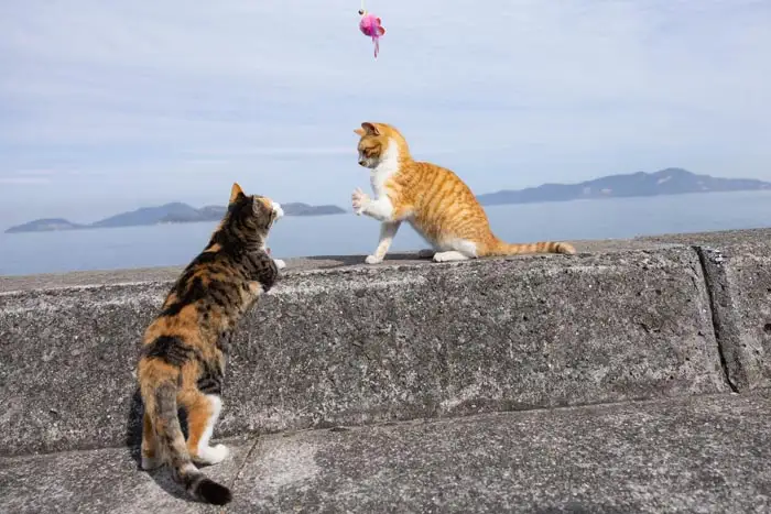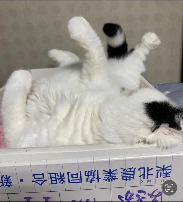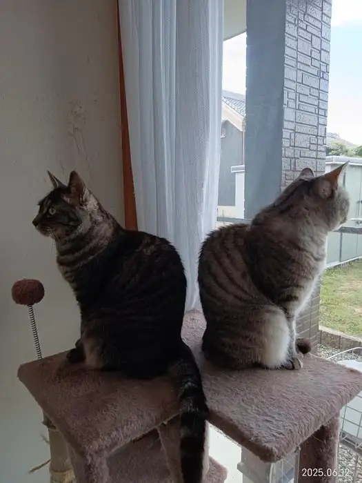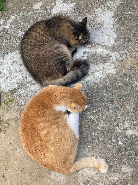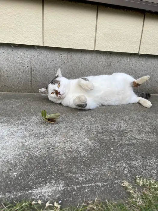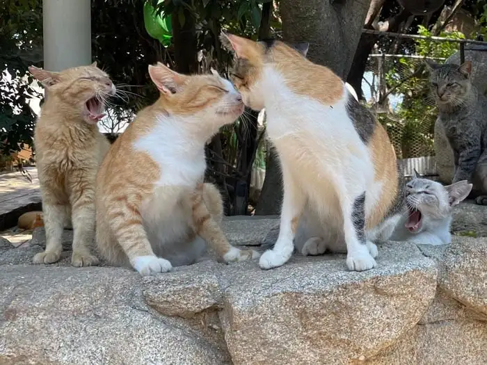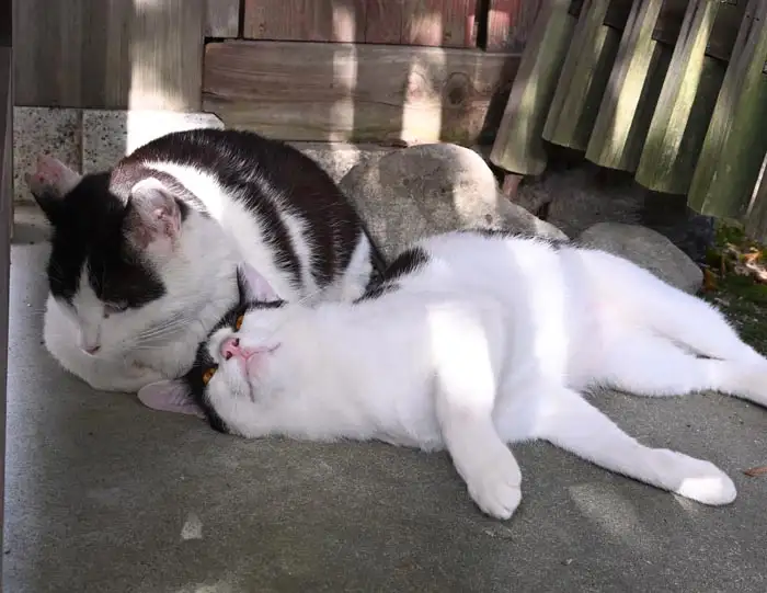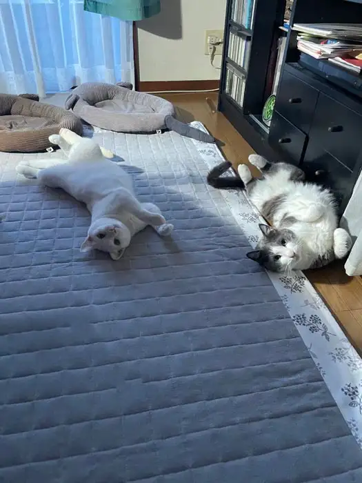 手前のコはおそらく背を掻いていたのかな。黒猫はその臭いに反応して、フレーメン反応(*)で口をほわっと開けている。それが「肉球そんなに臭いか?」とガン見しているようで、面白いです。
