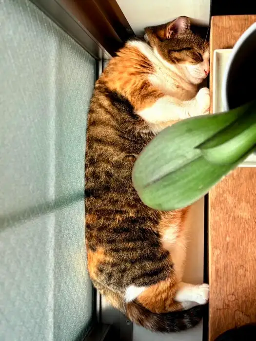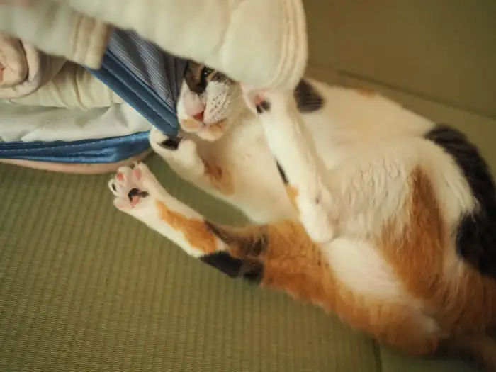 人間の女の子が、照れて布団に隠れようとしているみたいな仕草を良くとらえています。三毛猫の女の子というのも、それっぽいですよね。