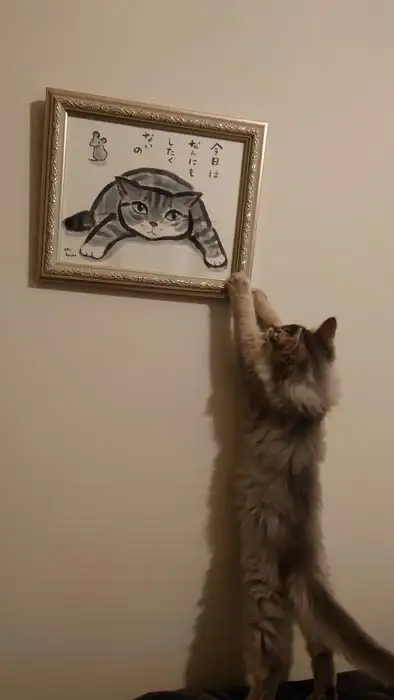 地にしっかりと両足をつけて、倒れないようにバランスをとって額を直している。働き者ですね。僕の展示会の設営時に連れて行きたいです。めちゃめちゃやる気のないネコを描いた額の絵と、働くこのコの対比も面白いですね。