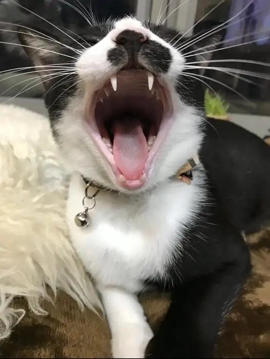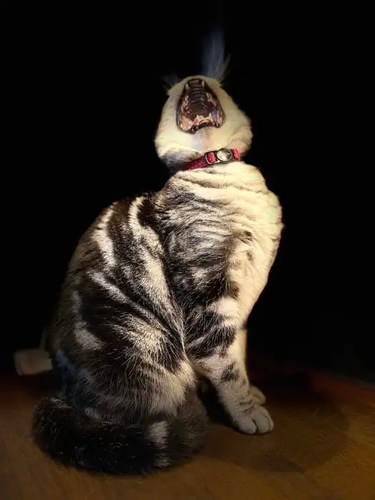 ヒゲがぶわーっと広がって、口がぽかーんと開いて、遠くを見ている。いい表情ですねえ。おそらくフレーメン反応(*)だとは思いますが、タイトルがそう見えるように導いてくれているので、まちがいなく何かに驚いているように見えます。