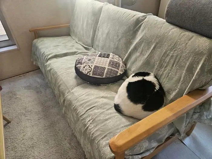 三人掛けのソファーに丸いクッションが2つ、いや、クッションは1つですが、お隣のクッションとほとんど同じサイズに丸まっているこのコ、現物と並んでいることで、クッションらしさが増しています。座り心地が良さそうだなア。