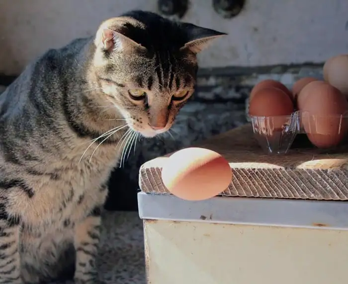 これはどう見ても卵です! なぜ落ちているのか不思議。後ろのパックからこぼれ落ちたのか、でも、ちょっかい出している素振りも見えないし……。このコも「なぜ?」という表情で見ている。見た人がみんな「なぜ?」となるシュールな一枚です。