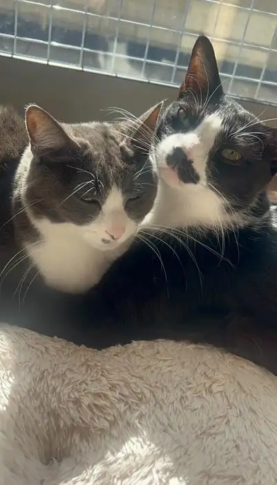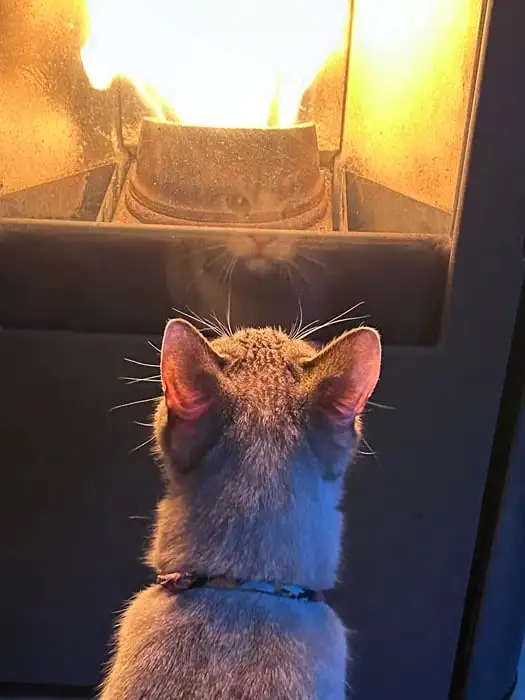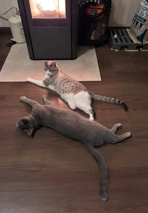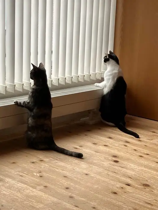 猫のシンクロは僕も大好きなシチュエーションです。背筋もピーン、尻尾もピーン、見ている先も一緒で後ろ姿が様になっています。ブラインドが閉じて外が見えないという情報量の少なさが逆に良いですね。「何を見ているんだろう?」と想像させてくれます。