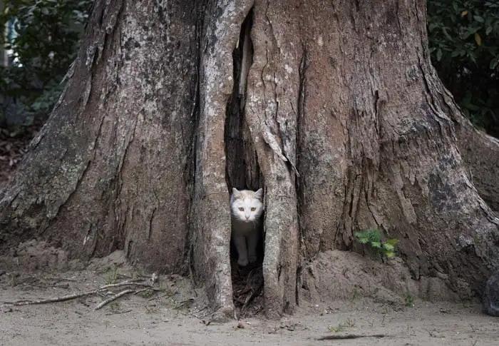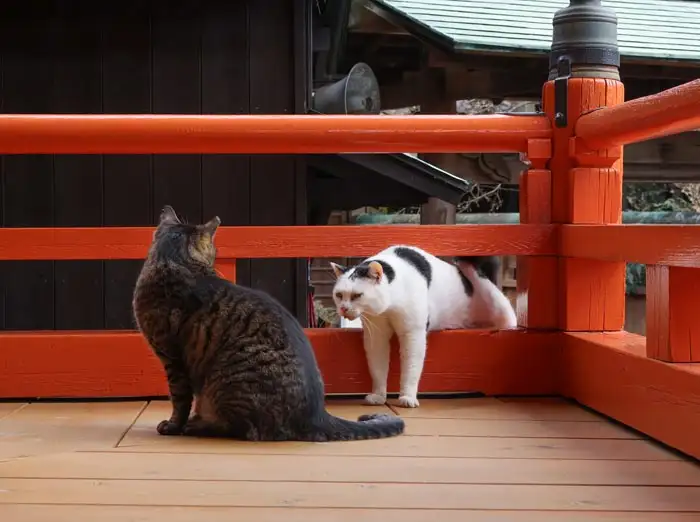たぶんあらゆる世代の方が、あの大ヒットホラー映画『リング』の貞子を思い浮かべるはず。境内の朱色と後ろの古めかしい建物も効いています。でも、ちょっとぽっちゃりのこのコはどう見ても呪いには縁遠そう。チュールくれたら帰りますけどみたいな感じがします。