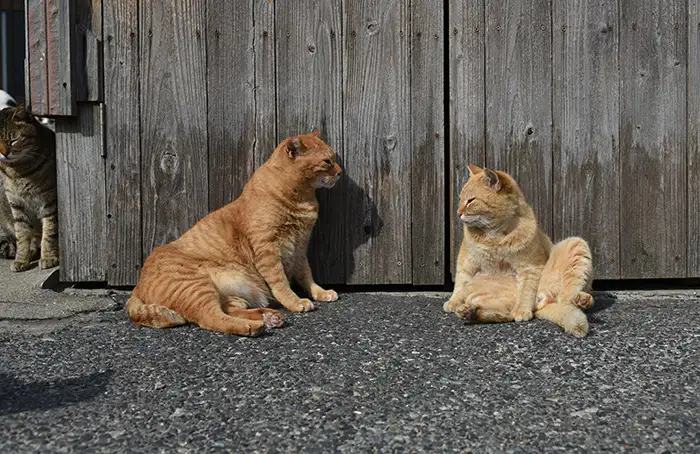 格好もおじさんなのですが、個人的には左の茶トラの子のぽよんとしたお腹が、最近の自分とも重なってしまいます。一番左端の子はカットして主題を引き立てても良いかもしれないです。