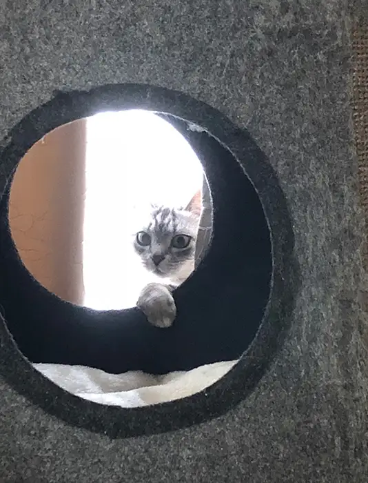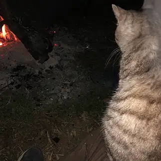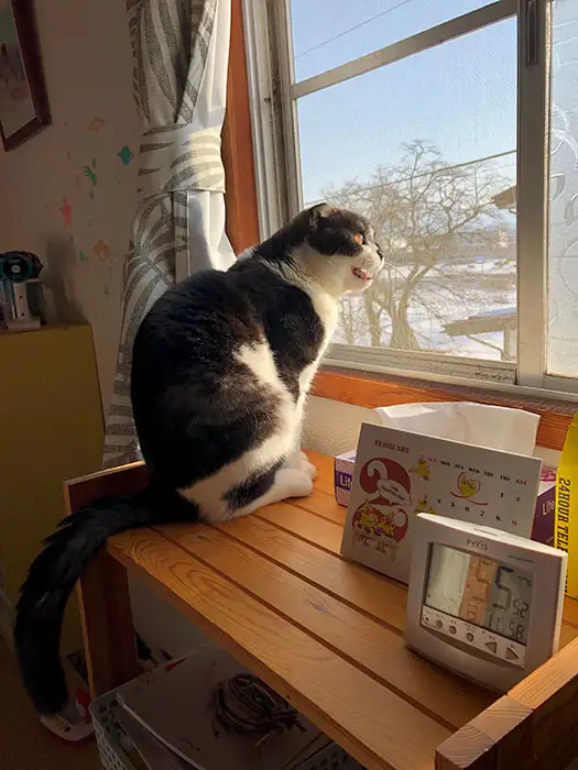 ガラス戸にあたる日の温かさ色合いが暖色で、レンジに乗っかってぽかぽかぬくもりを感じているのが見ていて、ほのぼのします。個人的にこんな顔、好きです。