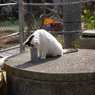 多分、子猫なんでしょうね。食事している大きな猫に立ち向かっても立ち向かえない空気感。影の部分とともにどんよりとした子猫の気持ちが伝わります。