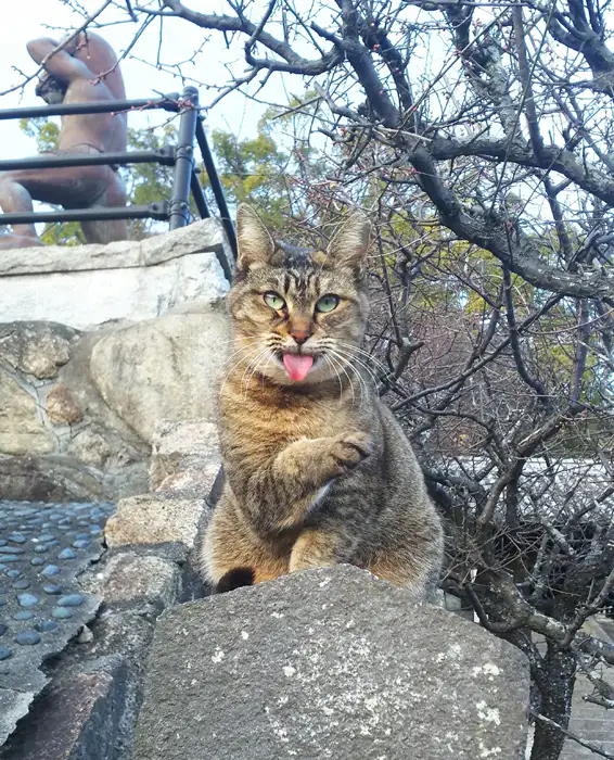 いつも投稿ありがとうございます。嬉々とした表情で舌をぺろっと出していて、なかなか僕は出会ったことのない表情です。また、後ろの銅像がなんかじわじわくる(笑)。あれは何なんでしょう?気になる写真です。