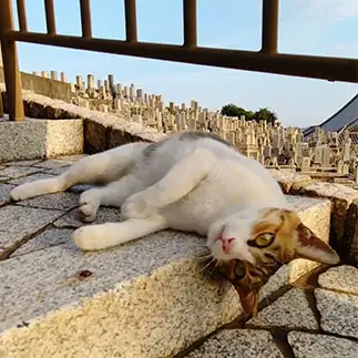 清々しい青空と、自信満々に足を開いてタマを見せつける絵が爽やかで選びました。立ちながら首元を掻く珍しい仕草をタイミングよく捉えていますね。