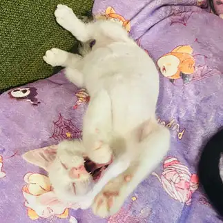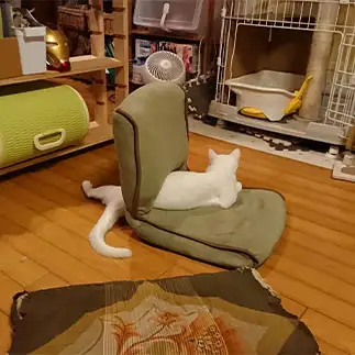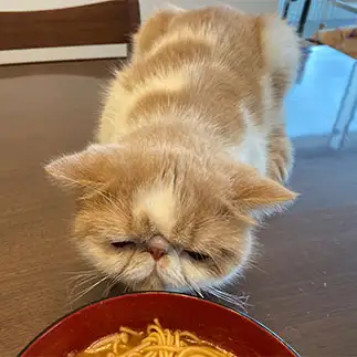 ジーン・シモンズがわからなくて、ネコ担一同で検索……なるほど確かに!と納得しました。額まで毛づくろいできそうなほど、しっかり舌が出ていますね。後ろのネコがのどかに寝ているのもポイントです。