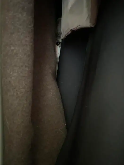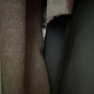 ネコが隙間からひょこっと顔を出すことはよくあるんですけど、この写真は顔に光が当たっていて、視線を集める役目を果たしているのがいいなと思いました。しっぽがたるんと垂れさがっている感じも、ネコのかわいさをよく表していますよね。