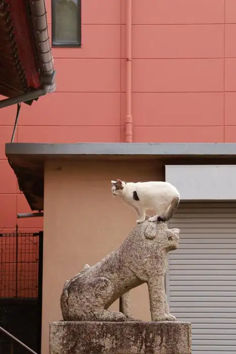 前回も狛犬とネコを選んだような気がしますが、今回の写真は少し離れたところから客観的に見ている感じがいい。絶妙な構図です。僕もこういう画を撮りたいのですが、なかなか立ち会えません。