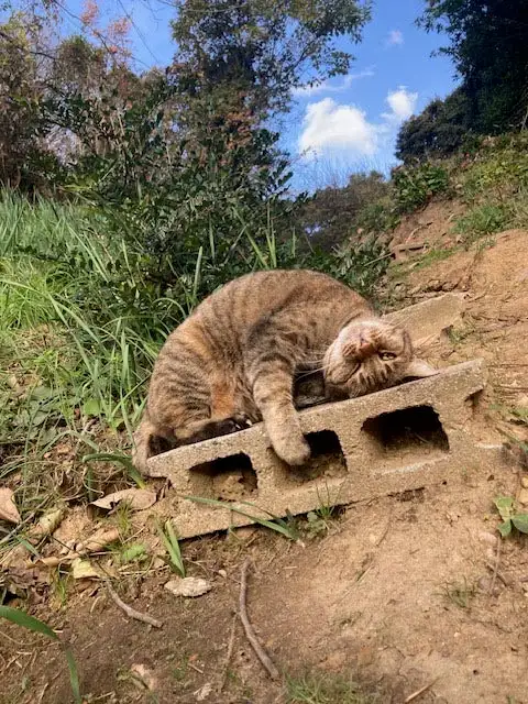 川沿いで、わざわざ石垣に手をかけないと届かないような葉っぱを食べるというのがネコっぽい。もっと簡単に食べられるところの葉っぱもあるだろうに。ネコらしいかわいさが伝わる1枚です。